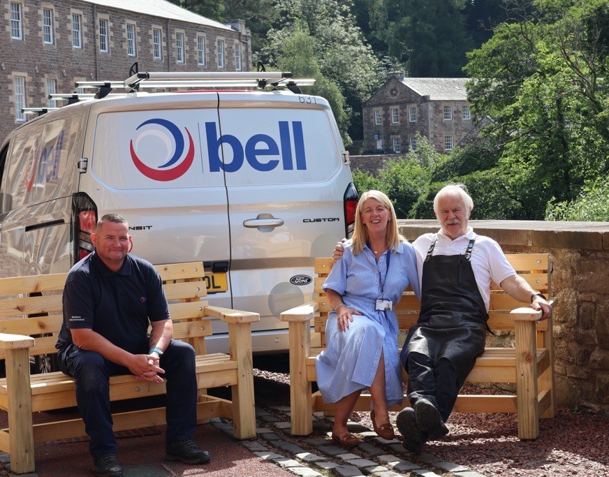 Benches beautifully crafted by Lanark’s Men’s Shed, a community organisation based at the New Lanark World Heritage Site, that supports connection and skill-sharing, especially among older men.